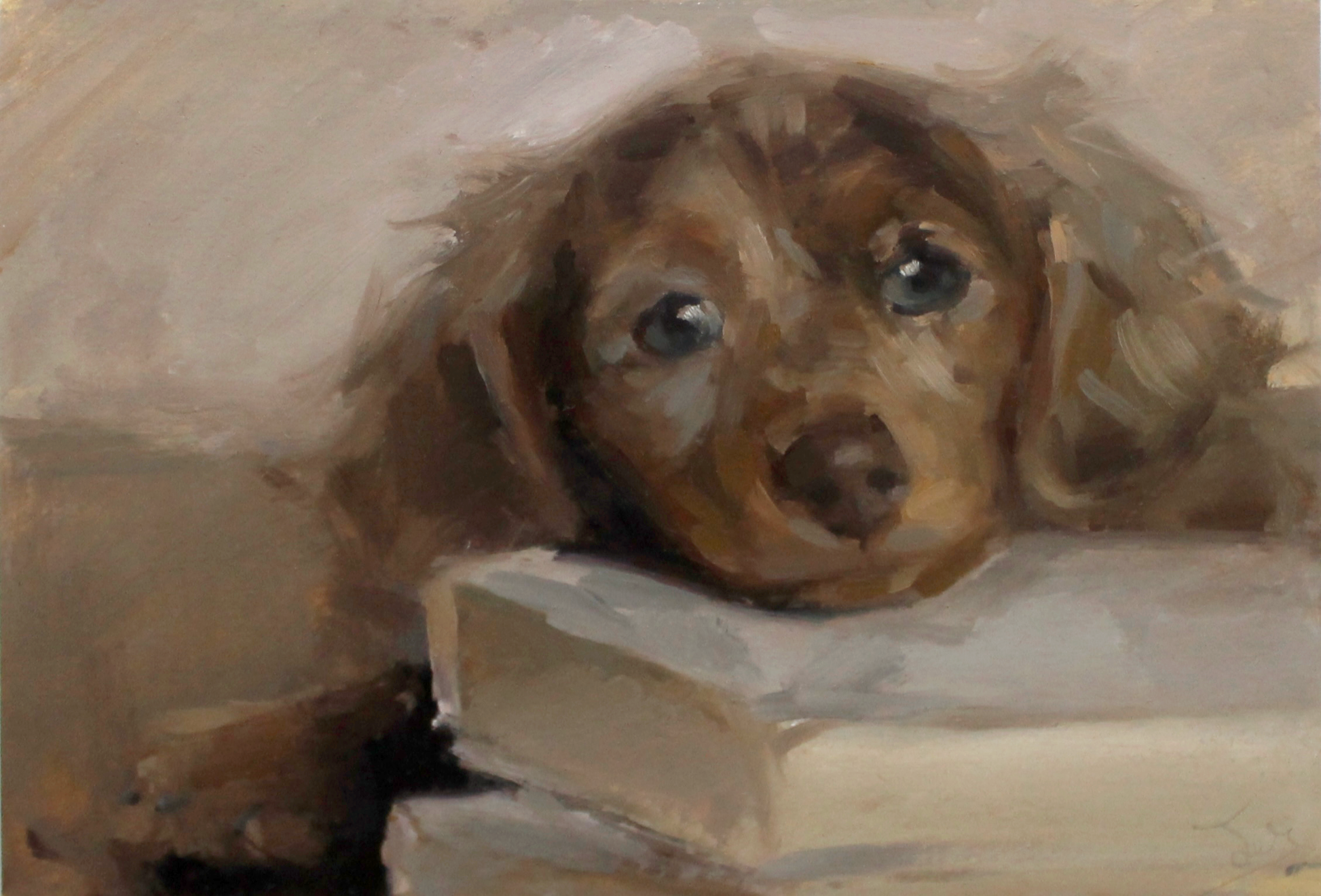 Bookrest – The Snoozing Puppy (Original Dachshund Oil Painting)